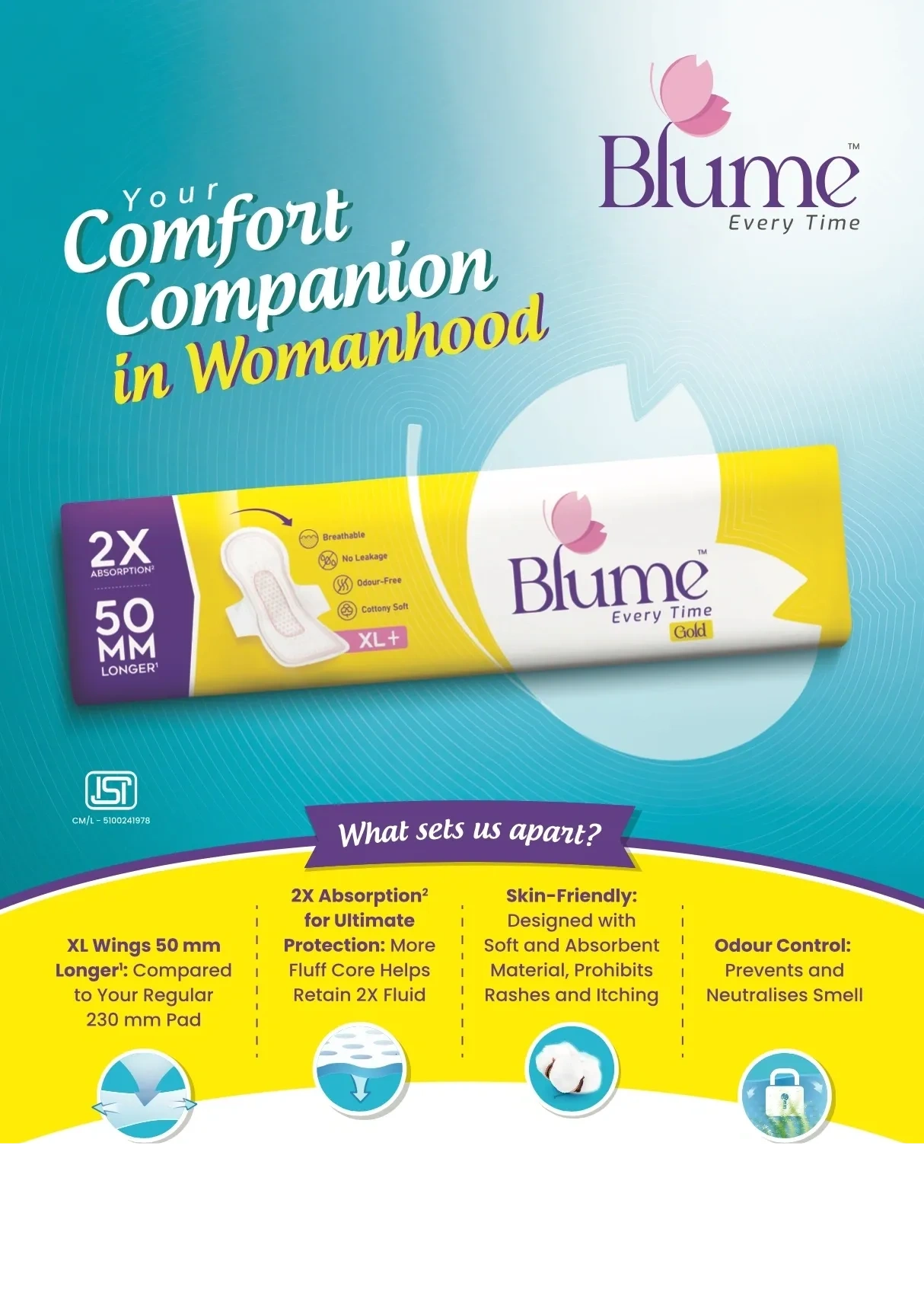 Stay confident and protected with Blume XL+ pads. With 2X absorption, 50mm longer wings, rash-free comfort, and odour control, Blume gives you the care you deserve—every time.
